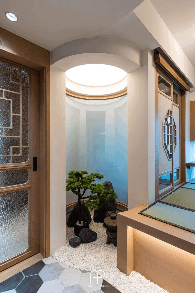 • 中式庭園元素: 玄關處的仿原木橫樑、碎石地面,以及中心處的屋內中庭,皆融入中式庭園的設計元素,營造出寧靜致遠的氛圍。
